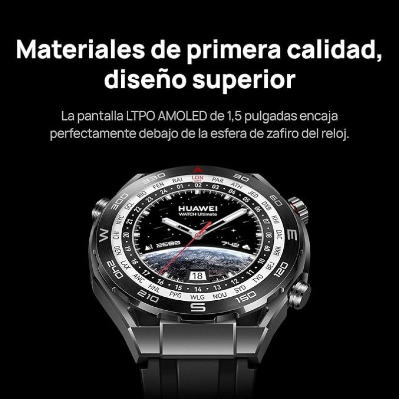 Materiales de calidad: el HUAWEI WATCH Ultimate, viene fabricado con metal líquido a base de circonio, con un bisel de cerámica de nanotecnología y una esfera del reloj de zafiro con pantalla LTPO AMOLED de 1,5 pulgadas, siendo un equipo robusto y resistente al desgaste