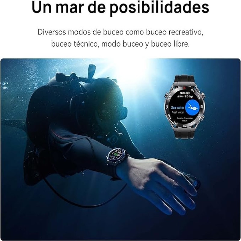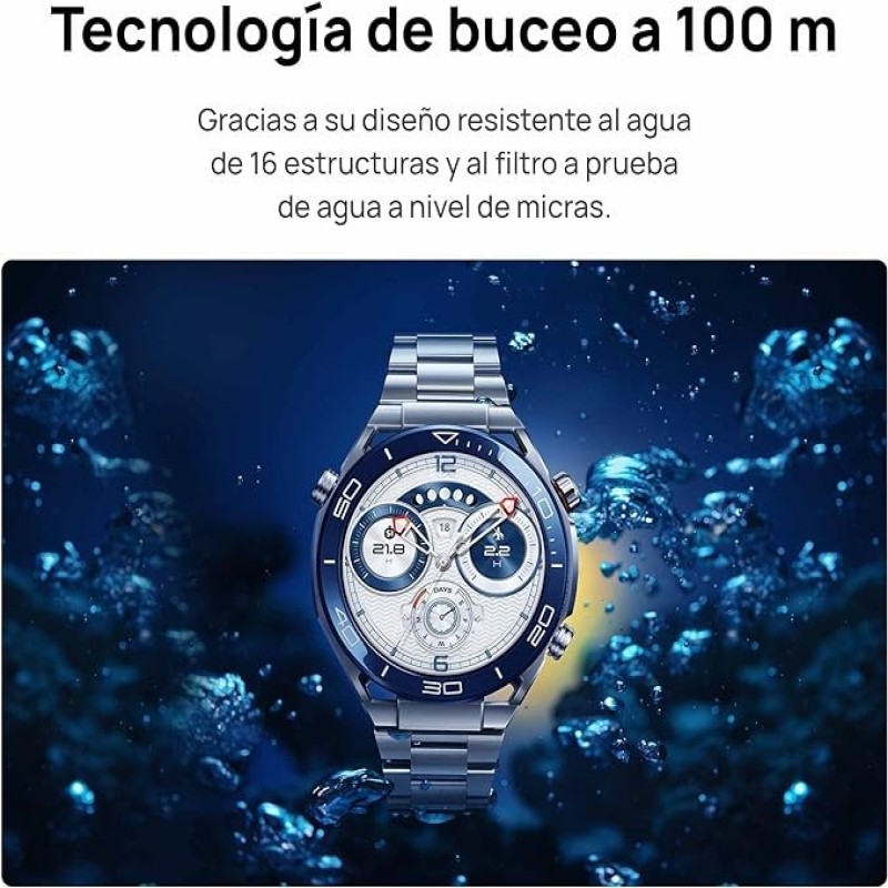 Tecnología de buceo a 100 m: el HUAWEI Watch Ultimate le permite realizar inmersiones más desafiantes, gracias a su diseño resistente al agua de 16 estructuras y al filtro a prueba de agua a nivel de micras; diversos modos de buceo como buceo recreativo, buceo técnico3, modo buceo3 y buceo libre