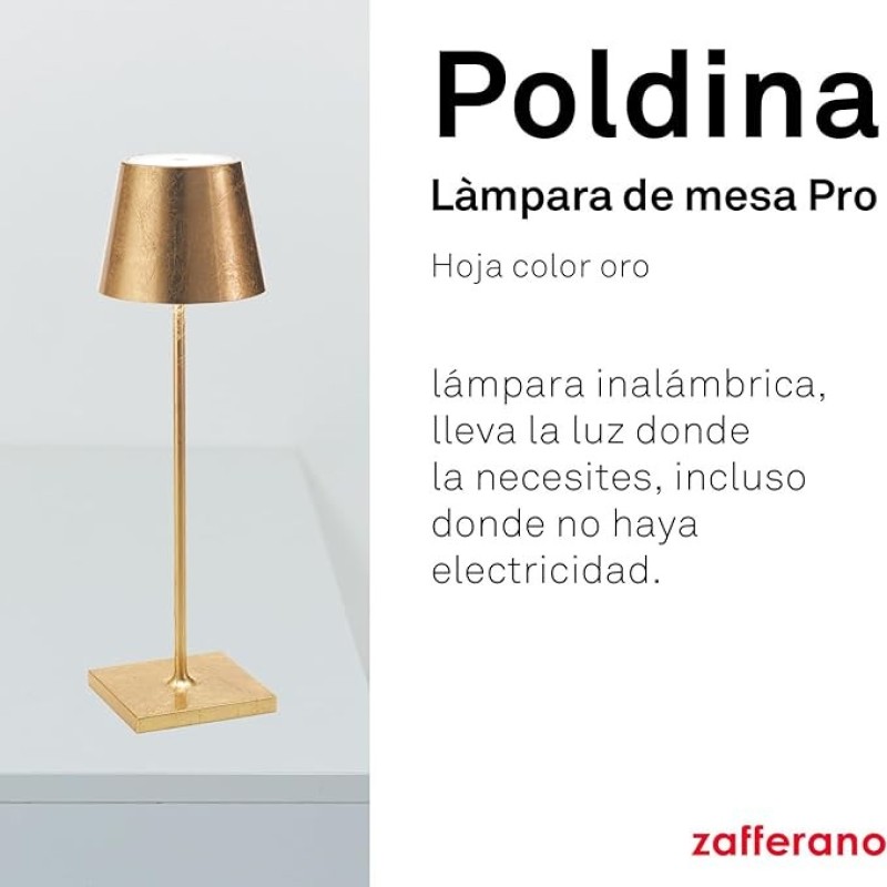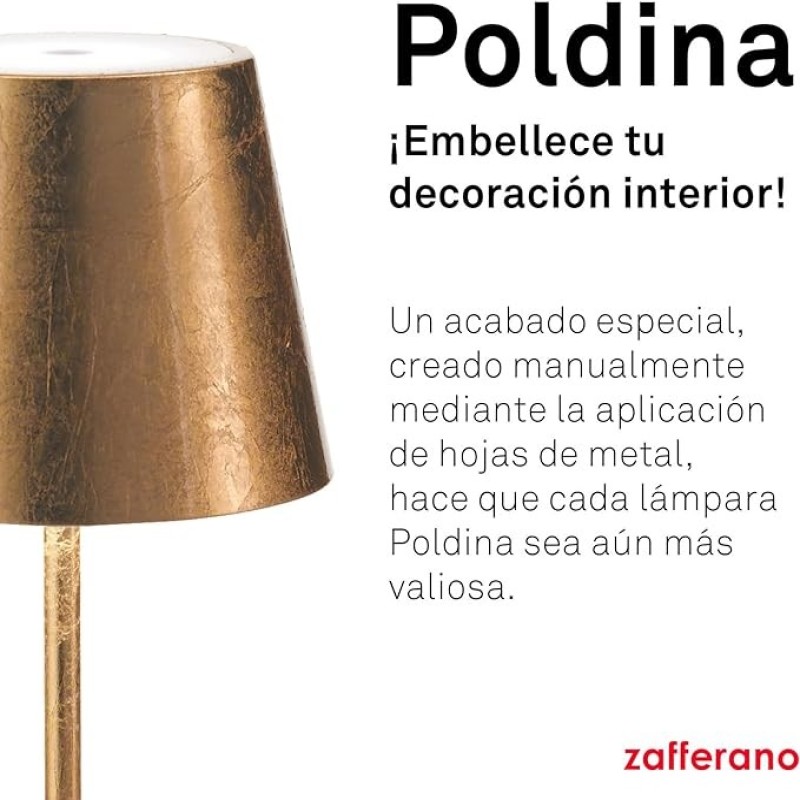 DECORA EL INTERIOR: Elige Poldina Pro para disfrutar de una noche con amigos, una cena o la lectura de un buen libro. La aplicación de la hoja color oro hace que la lámpara inalámbrica Poldina Pro sea aún más valiosa