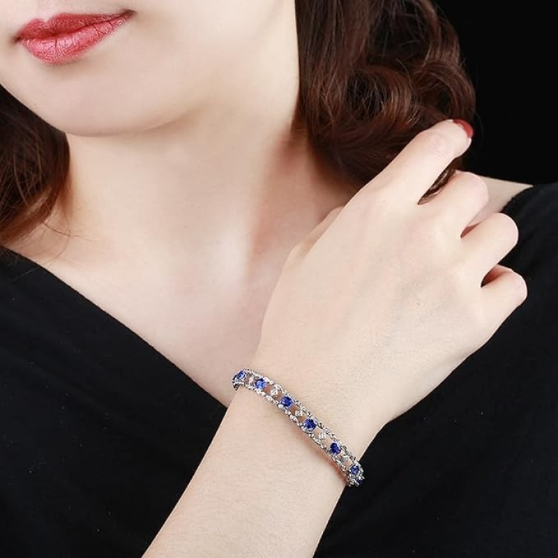 Epinki Pulsera Oro Blanco 18K para Mujer, Zafiro Laboratorio 5.23CT con Moissanita 1.07CT Brazalete Hueco 18CM