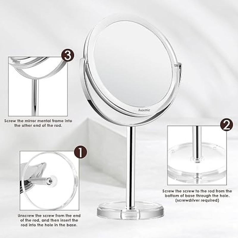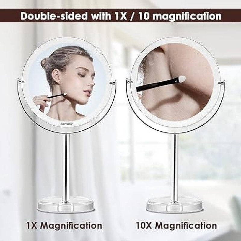 【Aumento 1X/10X】Auxmir espejo maquillaje de Mesa tiene dos caras, una de alta definición 1X es adecuado para todo tipo de maquillaje y uso diario, y la otra con aumento de 10X para un uso más detallado, como delineador de ojos, exprimidor de acné o maquillaje más fino. *NOTA: Cuando use el aumento 10X, tiene que acercar su rostro MUY CERCA (aprox. 10 cm) al espejo para ver con claridad. Si está demasiado lejos, verá su cara distorsionada o incluso saldrá boca abajo y puede provocar mareos.